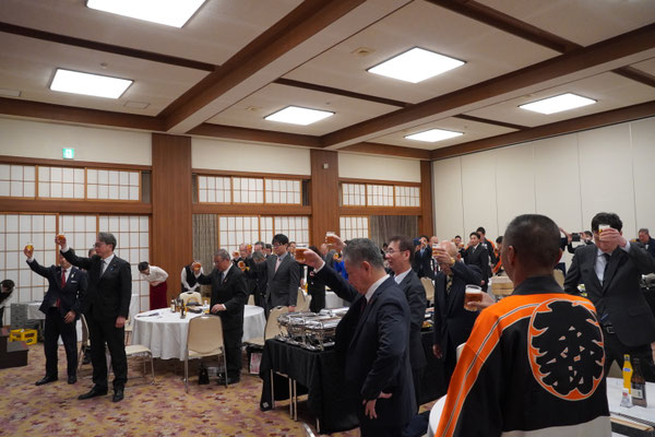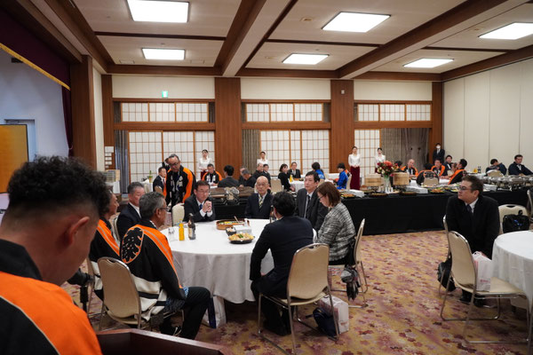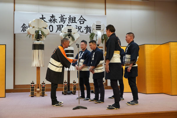 大森鳶組合は組合創立80周年を迎え、池上本門寺「朗峰会館」において祝賀会を開催いたしました。 朝から区内4か所での「はしご乗り」を終えたあと、大勢のご来賓をお迎えして組合員とともに80周年をお祝いしました。