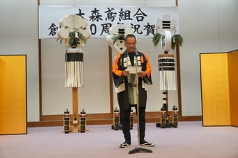 大森鳶組合は組合創立80周年を迎え、池上本門寺「朗峰会館」において祝賀会を開催いたしました。 朝から区内4か所での「はしご乗り」を終えたあと、大勢のご来賓をお迎えして組合員とともに80周年をお祝いしました。